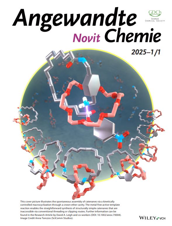 - ‘Metal-free active template synthesis of catenanes’, J Zhong, E Olivieri, P Zwick, A Troncossi, A S Baluna, D J Tetlow, G F S Whitehead, A Hasija and D A Leigh, Angew Chem Novit, 1, e70004 (2025). [Cover feature, Angew Chem Novit]