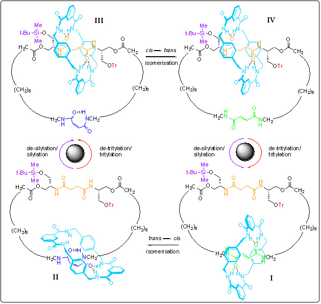 The fumaramide unit, however, has another trick: irradiate it with light at the correct wavelength (254 nm) and it is converted to its maleamide (cis-olefin) isomer. This unit has a very poor affinity for the small ring compared to the succinamide station. The change is reversible; a number of different stimuli (e.g. catalytic piperidine, bromine radicals (generated by Br2 and white light), or simply elevated temperatures (>100ºC) can bring about the opposite transition, restoring the fumaramide unit. This sequence can therefore repeatedly alter the order of the station binding affinities, switching the preferred position of the small macrocycle from bottom to top and back again: {bottom > top} » {top > bottom} » {bottom > top}……etc.