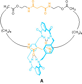 In [2]catenane A, the large macrocycle contains two binding sites, or ‘stations’ (shown in orange), for the smaller ring. When the blue ring is at those sites, hydrogen bonds (relatively weak, but directional bonding interactions) are formed between the two rings. At all temperatures above absolute zero, however, molecules are subject to thermal fluctuations. The result is Brownian motion – constant, random motion of molecules and their components. This thermal energy is sufficient to break the relatively weak hydrogen bonding interactions between the two rings and allow the small macrocycle to move (it is still constrained to follow the path of the large macrocycle, of course). The small macrocycle is thus able to explore the full circuit of the larger ring and can move between the two stations.