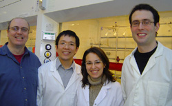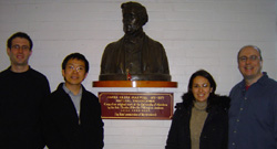 ‘The molecular information ratchet team in the James Clerk Maxwell Building, University of Edinburgh, 8th December 2006’ Left-to-right: Dr Euan Kay, Dr Chin-Fa Lee, Dott. Viviana Serreli and Prof Dave Leigh. [Click photo to enlarge]