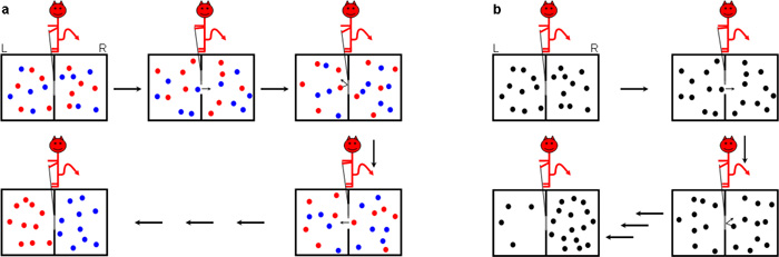 Figure 1. The Maxwell Demon thought experiments. a Maxwell’s ‘temperature demon’[2a,b] in which a gas at uniform temperature is sorted into ‘hot’ (red) and ‘cold’ (blue) molecules. The demon opens the gate between the compartments when it detects a cold particle approaching the gate from the left or a hot particle coming from the right, thus separating the particles according to their thermal energy and creating a temperature differential between the compartments. b A Maxwellian ‘pressure demon’[2c] in which a concentration gradient is established by the gate being opened only when a particle approaches it from the left. In both versions of the thought experiment the idea is that the demon’s actions involve no work being done, but as the end-result is a reduction in the entropy of the gas this is in conflict with the Second Law of Thermodynamics. Maxwell appreciated that the successful operation of the demon in the thought experiment somehow relied on its intelligence as an animate being. Subsequent analysis by several generations of scientists revealed a fundamental link between entropy and information, significantly influencing the development of statistical and quantum physics and chemistry, information theory and computer science.