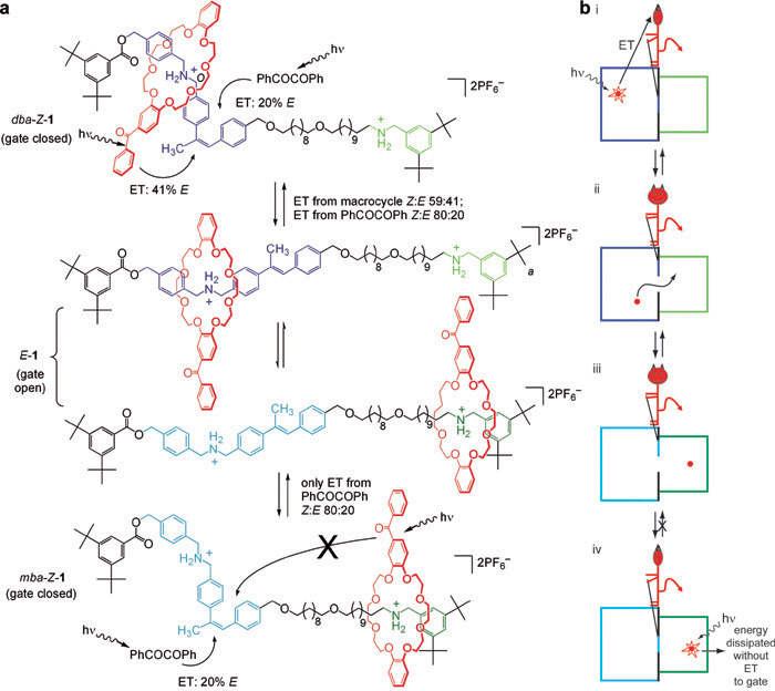 Figure 2. A photo-operated molecular information ratchet. a Irradiation of rotaxane 1 at 350 nm in CD3OD at 298 K interconverts the different forms of 1 and, in the presence of benzil (PhCOCOPh), drives the ring distribution away from its thermodynamic minimum without ever changing the binding strengths of the macrocycle or ammonium binding sites. When the macrocycle is on the mba binding site (green), intramolecular energy transfer (ET) from the macrocycle is inefficient and intermolecular ET from benzil dominates. When the macrocycle is on the dba binding site (blue), both ET mechanisms can operate. The amount of benzil present determines the relative contributions of the two ET pathways and thus the nanomachine’s effectiveness in pumping the macrocycle distribution away from equilibrium. b Cartoon illustration of the operation of 1 as a Maxwellian pressure demon[2c]: i Photo-induced excitation of a particle signals its position in the blue compartment by energy transfer to the demon operating the gate (the demon uses information from the asymmetry in the compartments to distinguish where the excited particles are most likely to be, here through their average distance from the gate). ii & iii The demon opens the gate and the particle shuttles incessantly between the two compartments by Brownian motion until the gate shuts trapping the particle at random in one of them. iv Photo-induced excitation of the particle in the green compartment is ignored by the demon and the energy of the excited state is dissipated as heat.
