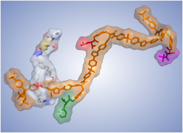 The mechanism of operation of the molecular machine is shown in Figure 1 (and is also shown in a video). First the ring is threaded onto a molecular strand using copper ions to direct the assembly process. Then a “reactive arm” is attached and the machine starts to operate. The ring moves up and down the strand until its path is blocked by a bulky group. The reactive arm then detaches the obstruction from the track and transfers it to another site on the machine, regenerating the active site on the arm. The ring is then free to move further along the strand until its path is obstructed by the next building block. This, in turn, is removed and passed to the elongation site on the ring, thus building up a new molecular structure. Once all the building blocks are removed from the track, the ring de-threads and the synthesis is complete.