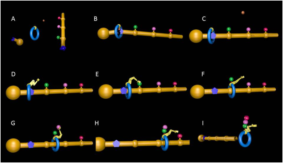 Figure 1. Mechanism of operation of the artificial molecular machine [image credit: Miriam Wilson]. A: Molecular ring, strand with building blocks (green, pink and red spheres) attached, stopper group and a copper ion. B: The copper ion directs the threading of the ring onto the strand and causes a chemical reaction that attaches the stopper, locking the components together (C). D: The reactive ‘arm’ is attached and the machine is now ready for operation. E: Molecular synthesis begins: The arm picks up the first building block (green) from the strand and, F, attaches it to a site on the moving ring. The ring is now free to move to the second building block (pink) which is, in turn, detached from the strand (G) and connected to the green unit (H). I: The process continues until all the building blocks have been removed from the strand by the molecular machine, at which point the synthesis is finished and the ring de-threads with the newly-formed peptide molecule attached (I).