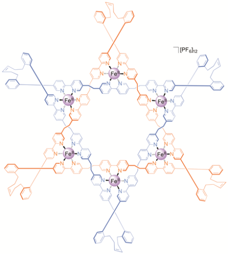 The Star of David topology, or 6-2-1 link, is an iconic symbol whose use in historical, religious, and cultural contexts stretches back to the dawn of human history (Figure 1).[1] It is a fundamental element of structure (like the trefoil[2] and pentafoil knots[3] and Borromean rings[4]) and as such has been an explicit, but until now unrealized, target of synthetic chemistry for a quarter of a century.[5] Now chemists at the University of Manchester have described the first Star of David molecular link (a triply interlocked [2]catenane).[6] The woven scaffold is a circular hexameric helicate[7] generated by the assembly of six tris(bipyridine) ligands with six Fe2+ cations, the size of the helicate dictated by the use of sulfate anions. The structure of a carefully chosen ligand extension directs subsequent capture of the molecular architecture by ring closing olefin metathesis. Confirmation of the Star of David topology and structure—two triply-entwined 114-membered rings—is provided by various methods, including X-ray crystallography (Figure 2). Extraction of the iron(II) ions with Na4EDTA affords the wholly organic triply-entwined molecular link.
