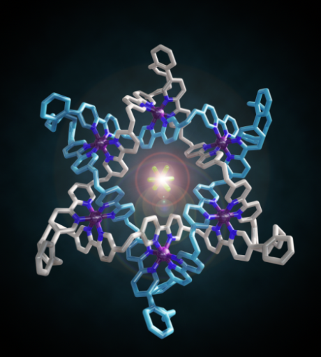 Figure 2. Make me a star! The chemical formula and X-ray crystal structure of two triply entwined 114-membered rings, a molecular 6-2-1 link, featuring iron ions (shown in purple), nitrogen atoms (dark blue), carbon atoms (one ring shown in orange/white; the other in light blue) and a single PF6-ion (green and orange) at the centre of the structure. [‘A Star of David Catenane’ David A. Leigh, Robin G. Pritchard and Alexander J. Stephens, Nature Chem, published online 21 Sept 2014]. Image credit: Robert W. McGregor (www.mcgregorfineart.com) and Alex Stephens. For a fly-around movie of the X-ray crystal structure click here.