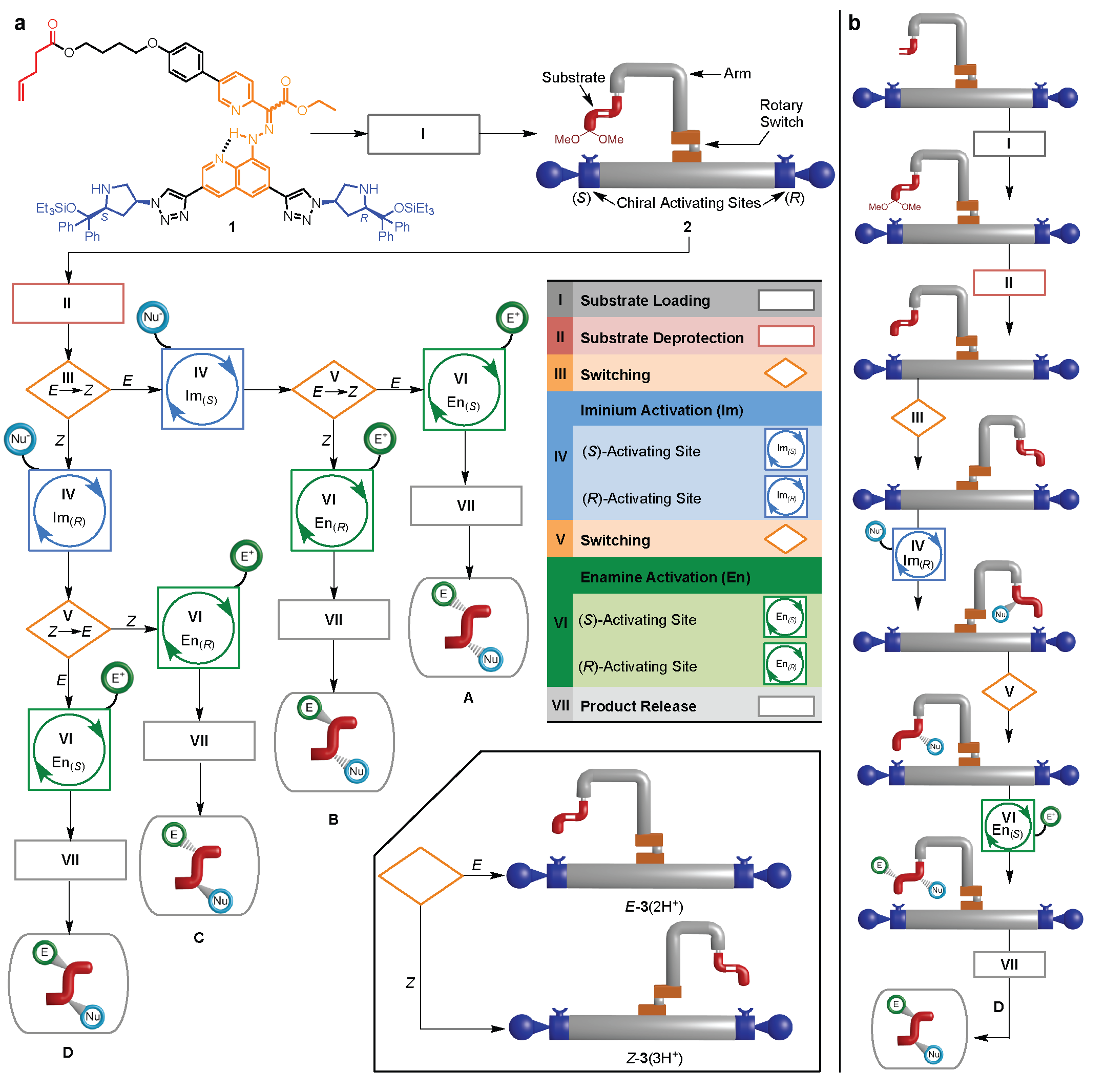 Figure 2. Programmable operation of a molecular machine that synthesizes different products by moving a substrate between different activating sites. a, Flowchart showing the programmable synthesis of any one of four stereoisomers by the molecular robot. b, The molecular robot’s response to command inputs in program D.