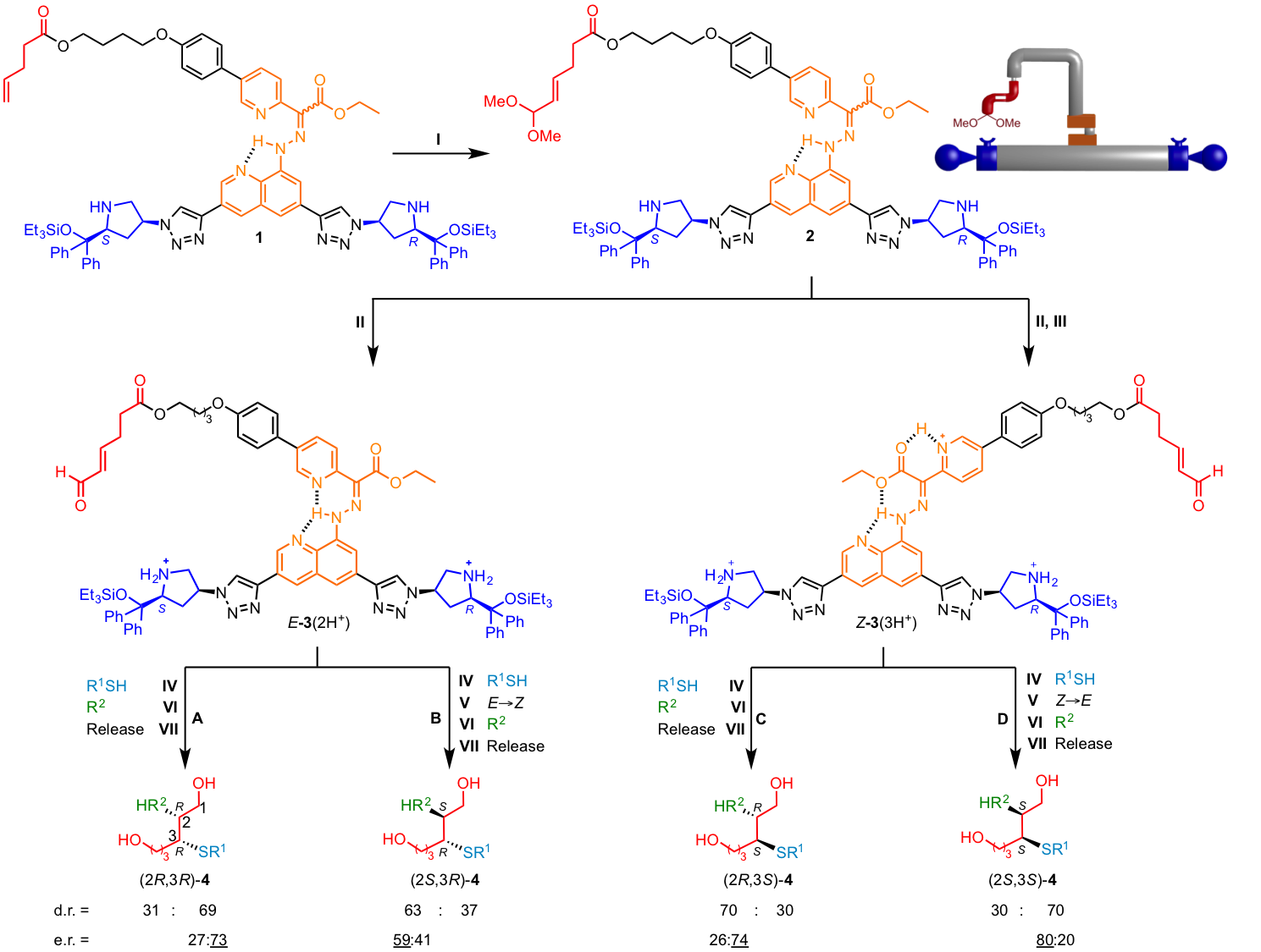 Using a thiol nucleophile for the first reaction (iminium activation of the substrate by the machine) and an electron-poor alkene electrophile for the second reaction (enamine activation of the substrate by the machine) any of the four possible products can be selectively made by the robot in one pot through different programing (Figure 3 and Figure 4). However, the machine does not behave exactly as designed, the relative stereochemistry of the second reaction is controlled by the switch-state rather than the chirality of the organocatalyst as originally envisioned. This illustrates the challenge and complexity of designing multicomponent molecular machines with interactive parts.14