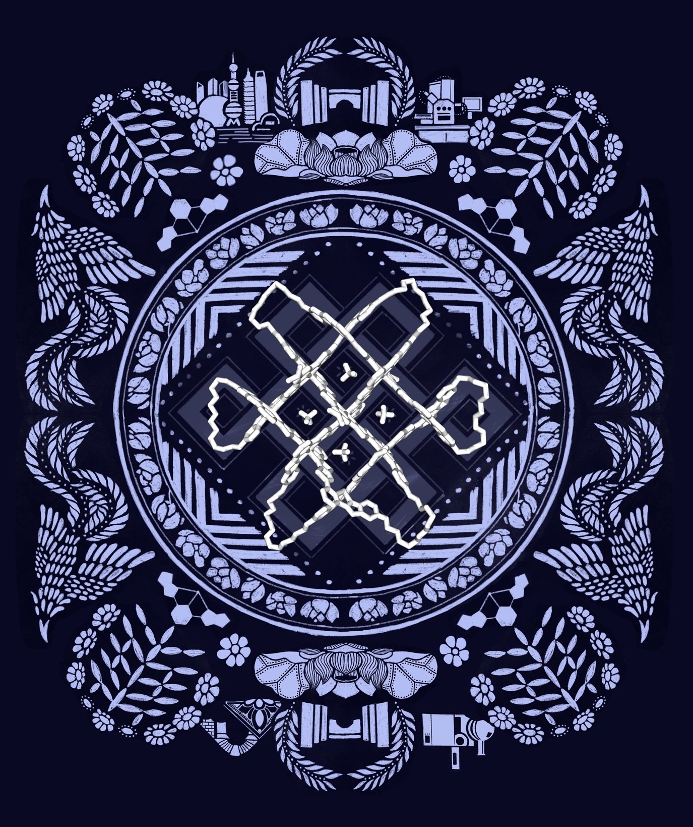 [A traditional Chinese blue calico tapestry featuring a molecular endless knot. Design by Profs Bailang Yu and Xi Tang and student Ziqi Su, School of Geographic Sciences, East China Normal University.]