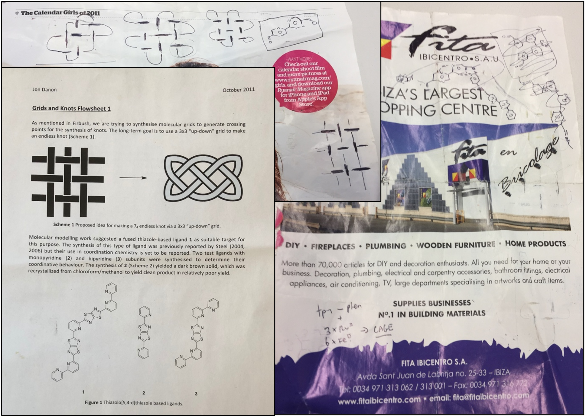 While we were developing the circular helicate strategy to complex knots and links, then-post-doc Jon Beves (now an Associate Professor at the University of New South Wales, Australia) came up with a brilliant complementary plan: woven grids. Jon led our team that made Solomon links using 2x2 woven grids,16 but his original sketch (on a page from a 2011 RyanAir magazine) showing how the concept could, in principle, be used to make a 74 endless knot using a 3x3 interwoven grid is shown in Figure 2, together with the first design we worked on (developed by Jon, Jean-François Ayme, Chris Campbell and Jon Danon during our annual group conference, at that time held on the shores of Loch Tay in Scotland).