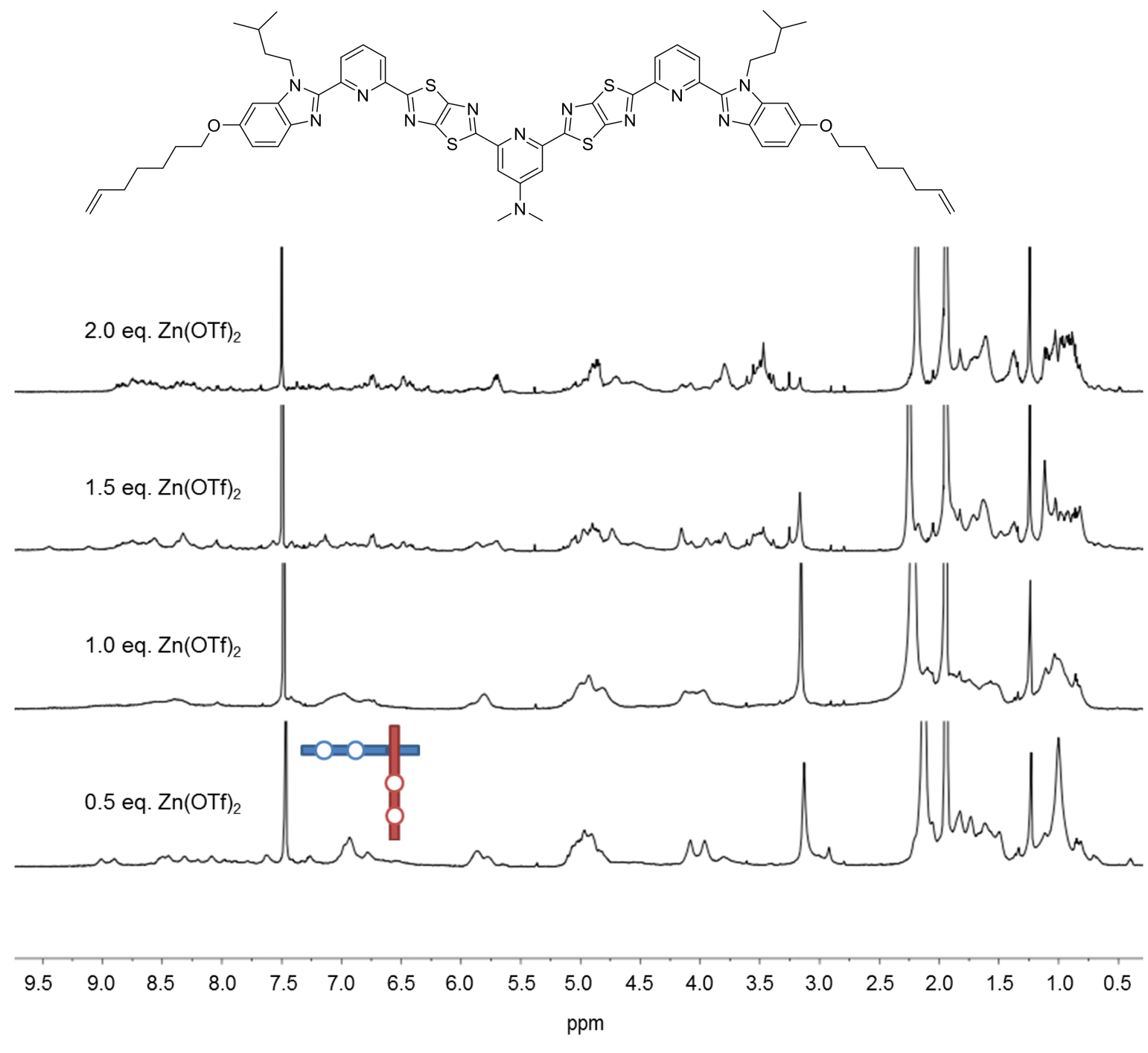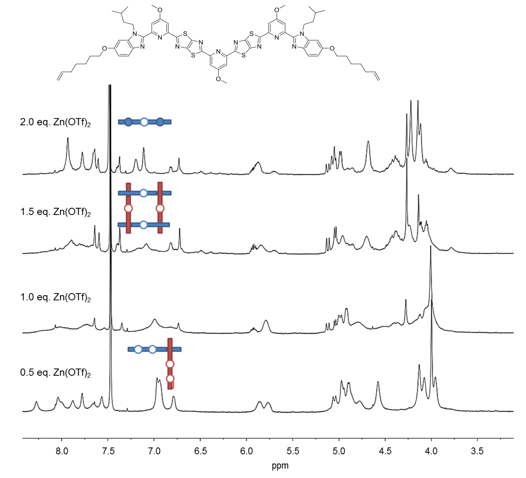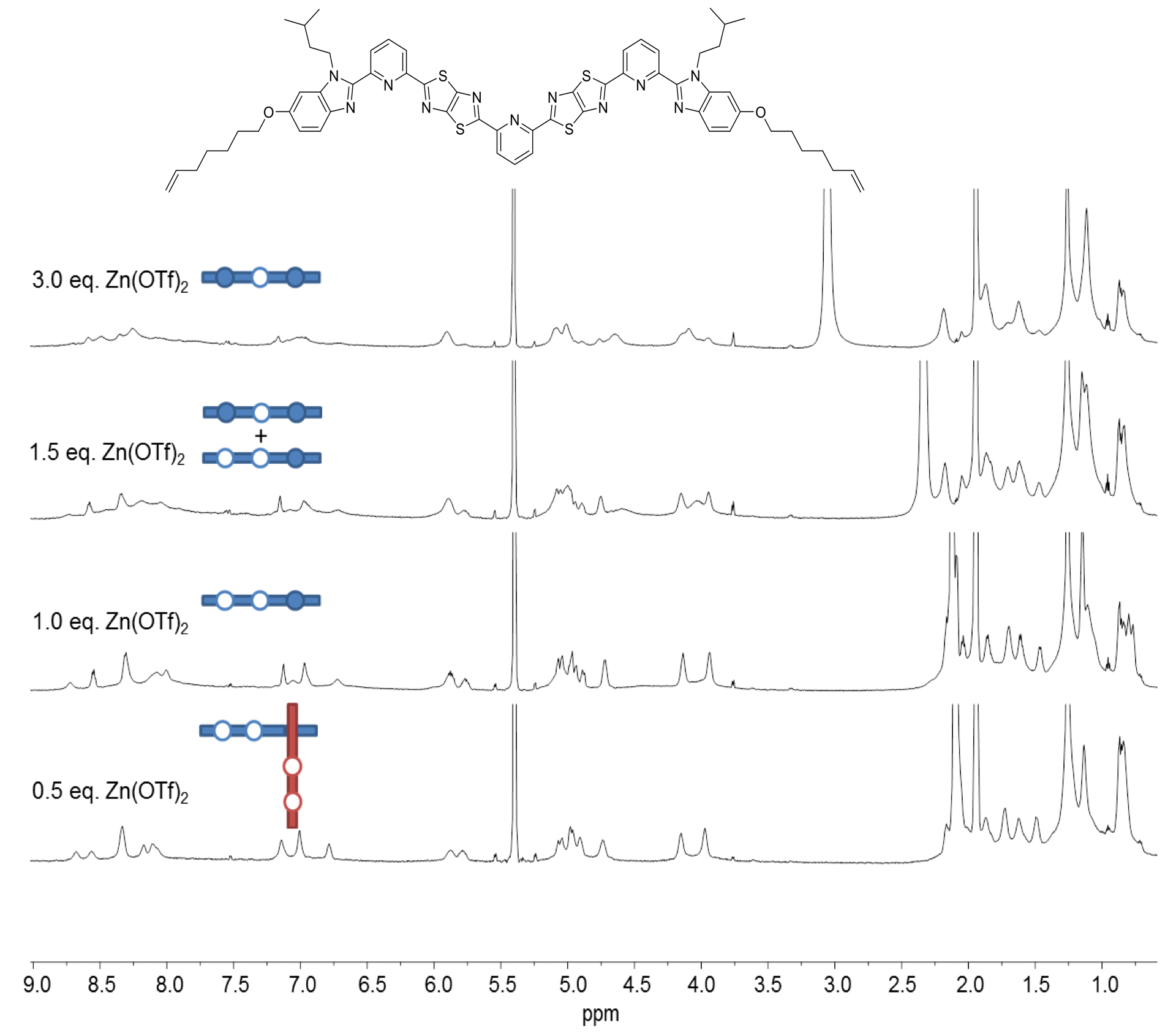 Fig. 5. 1H NMR (600 MHz, 298 K) spectra of titration of third ligand strand design with Zn(OTf)2 in a mixture of CD3CN/CD2Cl2.