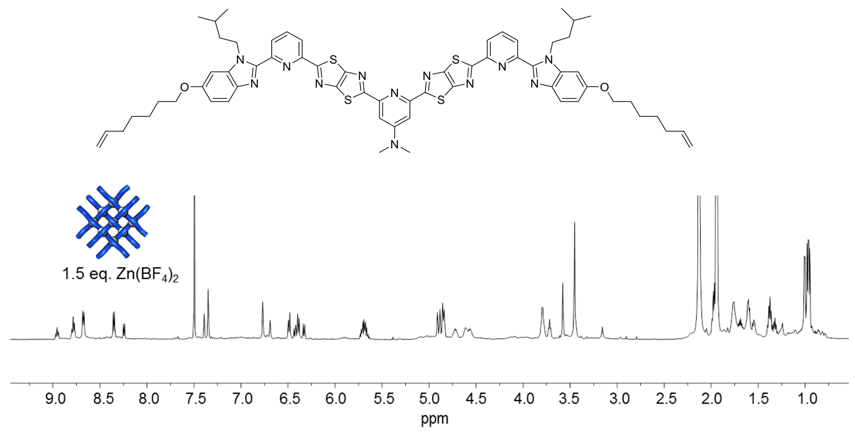 The coordinating ability of the central pyridine unit was further enhanced by replacing the methoxy group with a dimethylamino one (Fig. 5), with the outer pyridines reverting to being unsubstituted at the 4-position to maximise the difference between the outer and difficult internal sites. When 1.5 equiv. of Zn(OTf)2 was added to this ligand, the theoretical stoichiometry required for nine zinc cations to bind to six ligands, a complex mixture of species was observed but still with no sign of interwoven grid formation (Fig. 5).