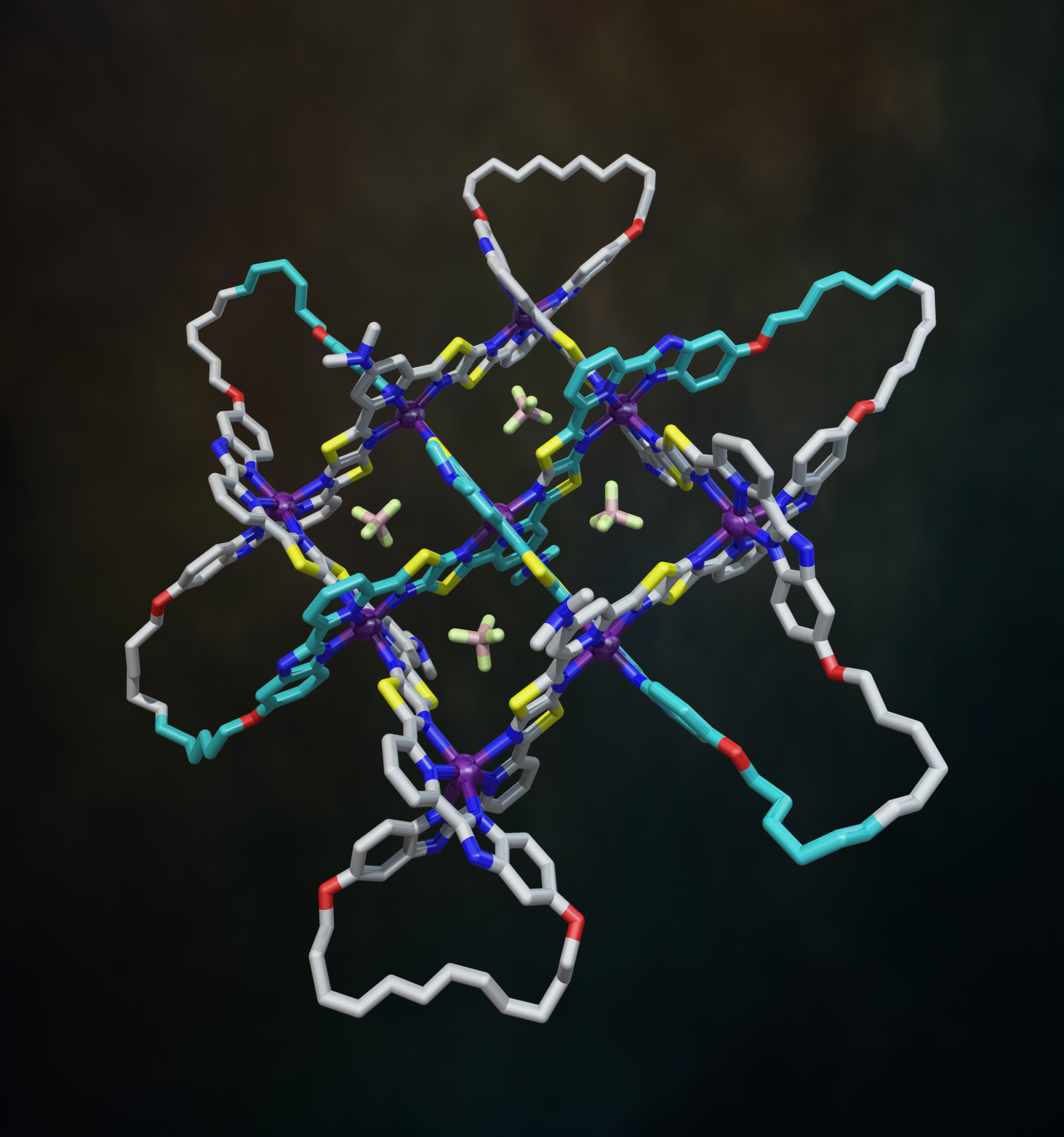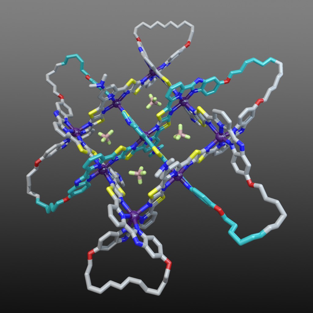 Fig. 7. Molecular 74 knot coordination complex (with 6 x Fe(BF4)2) based on the X-ray structure of the 3x3 interwoven grid with modelled cyclized end groups. Video credit: Alberto Valero.