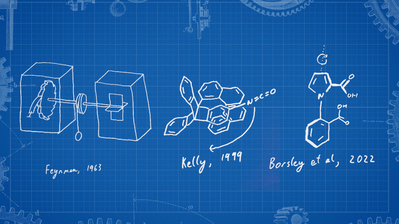 Figure 1: Designing brownian ratchet rotary molecular motors. Feynman’s ratchet-and-pawl7 (left): The celebrated thought experiment postulated a molecular-scale ratchet that could extract work from a heat gradient. Kelly’s rotor (middle) was the first step towards realising Feynman’s vision.4 Kelly’s rotor could perform a partial (120°) directional rotation through a sequence of chemical reactions. Now Borsley et al’s motor8 (right) realises the goal of autonomous repetitive 360° directional rotation about a covalent single bond through the presence of a chemical fuel.