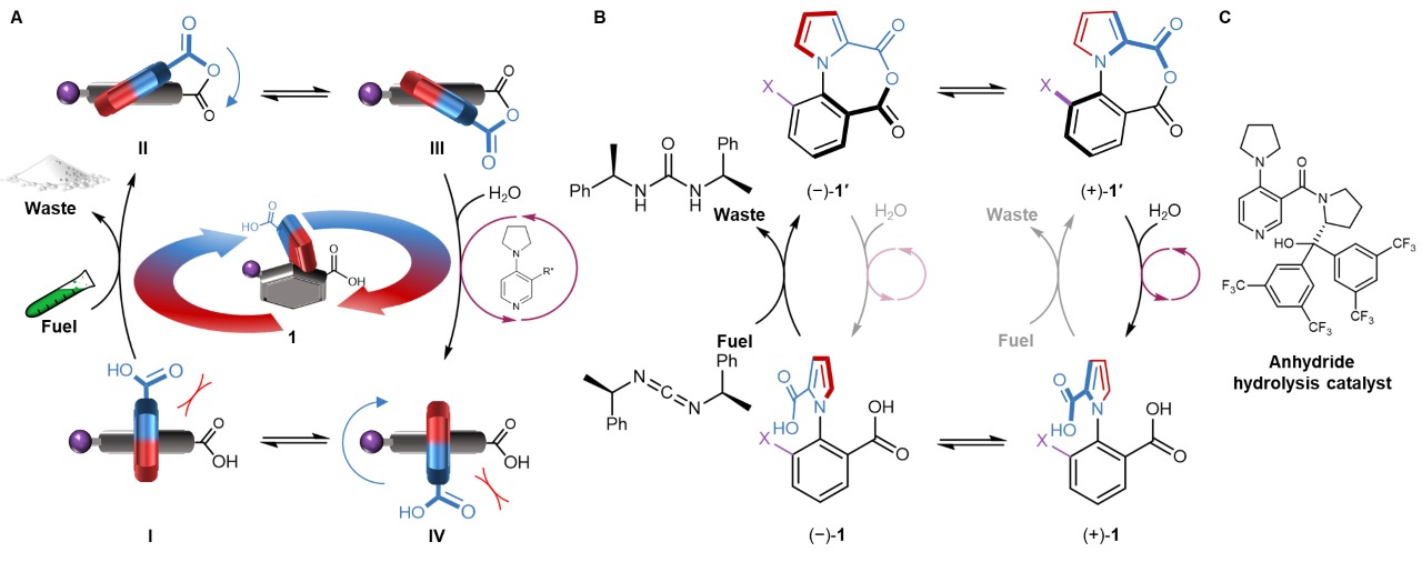 Figure 2: Chemical engine cycle of an autonomous, continuously operating, chemically fuelled single bond rotary motor. (A) Schematic representation of chemically powered rotation of the rotor (pyrrole-2-carbonyl) around the stator (phenyl-2-carbonyl) for 1-arylpyrrole 2,2′-dicarboxylic acid 1.8 Rotation of the rotor carbonyl (blue) past the 6-position (purple) of the stator is favoured in the acid form 1 (IV⇌I), while passing of the rotor carbonyl past the stator carbonyl is only possible in the tethered anhydride form 1′ (II⇌III). The chiral carbodiimide ‘fuel’ kinetically favours anhydride formation I➜II over IV➜III, while the chiral hydrolysis catalyst (shown in part C) kinetically favours III➜IV over II➜I. (B) Chemomechanical cycle for autonomous chemically fuelled rotation of 1. The grey arrows indicate slower transformations than the corresponding black arrows. To be consistent with microscopic reversibility, all transitions should be considered reversible, although under the experimental conditions the position of equilibrium of the fuel-to-waste reaction heavily favours carbodiimide hydration. (C) Chemical structure of anhydride hydrolysis catalyst.