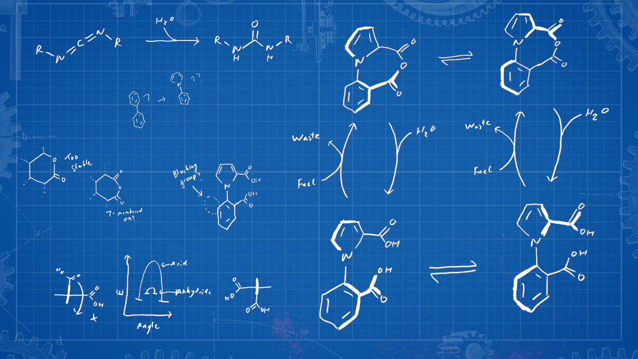 Now, the Leigh group have shown that a 26-atom biaryl compound (1-phenylpyrrole 2,2′-dicarboxylic acid) is a catalysis-driven motor that continuously transduces energy from a chemical fuel to induce repetitive 360° directional rotation of the two aromatic rings around the covalent single bond that connects them (Fig. 2).8 Upon treatment of the motor-molecule with a carbodiimide fuel, intramolecular anhydride formation between the rings, and the anhydride’s hydrolysis, both occur incessantly (Video 2). Both the anhydride formation and hydrolysis reactions are directionally biased (they occur faster through particular rotamers of the biaryl system). In this way, catalysis of the hydration of the carbodiimide fuel by the motor continually drives net directional rotation of the rotor around the stator. Each 360° rotation of the motor requires the reaction of a fuel molecule (there is no background ring rotation), takes as little as a few minutes at modest fuel concentrations, and has a directional bias of up to 71:29 with a chirality-matched fuel and additive. In other words, the motor makes a ‘mistake’ in direction every 3–4 turns. Furthermore, because the direction of rotation only depends on the chirality of the fuel and an added hydrolysis catalyst, it is easily reversed.