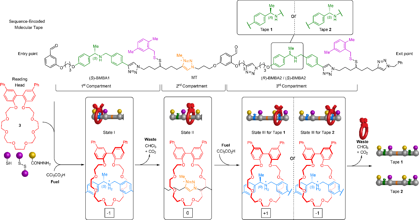 (i) In the artificial molecular machine design, stereochemistry is used for the ‘symbols’ to encode information in the molecular tape. This is very different to biology, which uses chemoselectivity (different hydrogen bonding motifs of different nucleotides) for this purpose.2