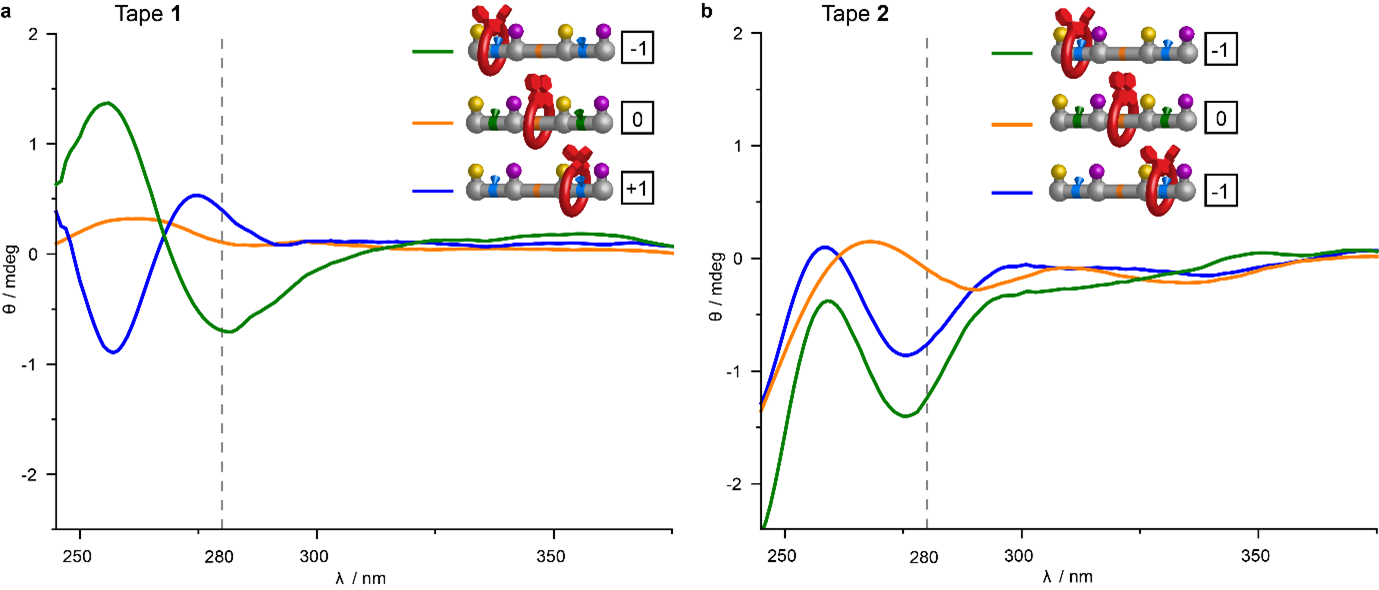 Figure 2: Circular dichroism (CD) spectra of the machine states formed by the stepwise ratcheted operation of macrocycle 3 along molecular tapes 1 (encoded −1,0,+1) and 2 (encoded −1,0,−1). a, CD spectra of components and machine states from the reading of tape 1. b, CD spectra of track and machine states from the reading of tape 2. The machine state can be read by the sign and intensity of the CD spectrum at 280 nm. Experiments were carried out in CHCl3, [C] = 100 μM.