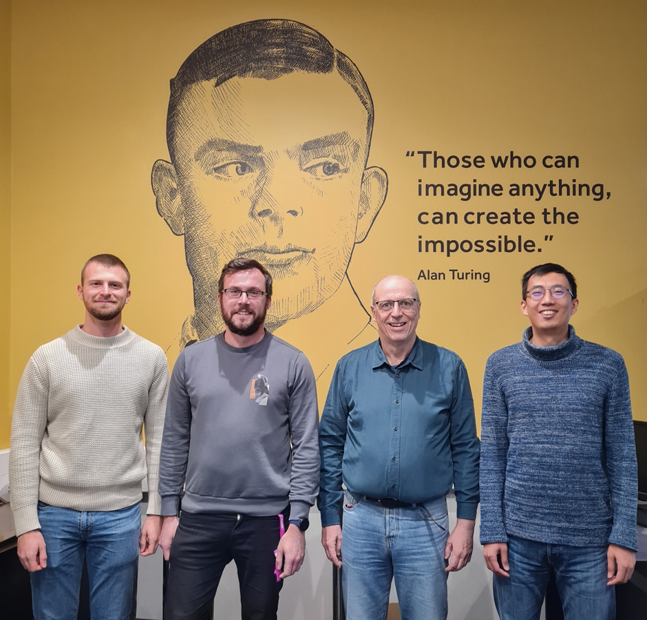 Members of the tape-reading ratchet team, Alan Turing Building, University of Manchester, 17th October 2022. Left-to-right: Romain Jamagne, Dr Daniel Tetlow, Prof. David Leigh and Dr Yansong Ren.
