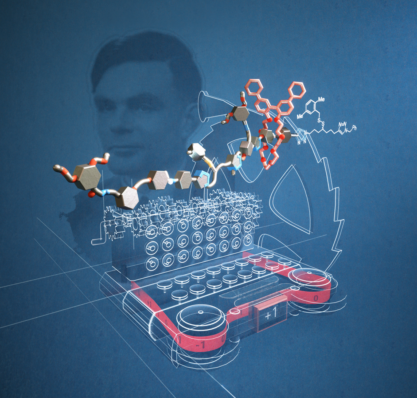 In 1936 Alan Turing published a concept for an automatic machine for abstract computing.1 Nowadays called a ‘Turing machine’, his proposal envisaged a device that featured a ‘head' that could read and write symbols while moving along a tape. This influential thought experiment helped spark the development of modern computer science. Although no practically useful device that functions according to Turing’s original design has ever been made (modern computers use a different design that employs random access memory), the resemblance of Turing’s ‘automatic machine’ to information processing in biology is striking (the reading and writing of information by the ribosome, for example2,3). Now scientists at the University of Manchester have made an artificial molecular machine that moves along a molecular tape, changing the reading head’s shape (conformation) in response to ‘symbols’ on the tape it encounters along the way.4 The geometrical change alters how light is twisted (clockwise, anticlockwise, or not twisted) by the head and so the sequence of symbols on the molecular tape can be read out as a string of data according to the changing twisting of light (clockwise corresponds to the digit +1; anticlockwise to -1, not twisted to 0).
