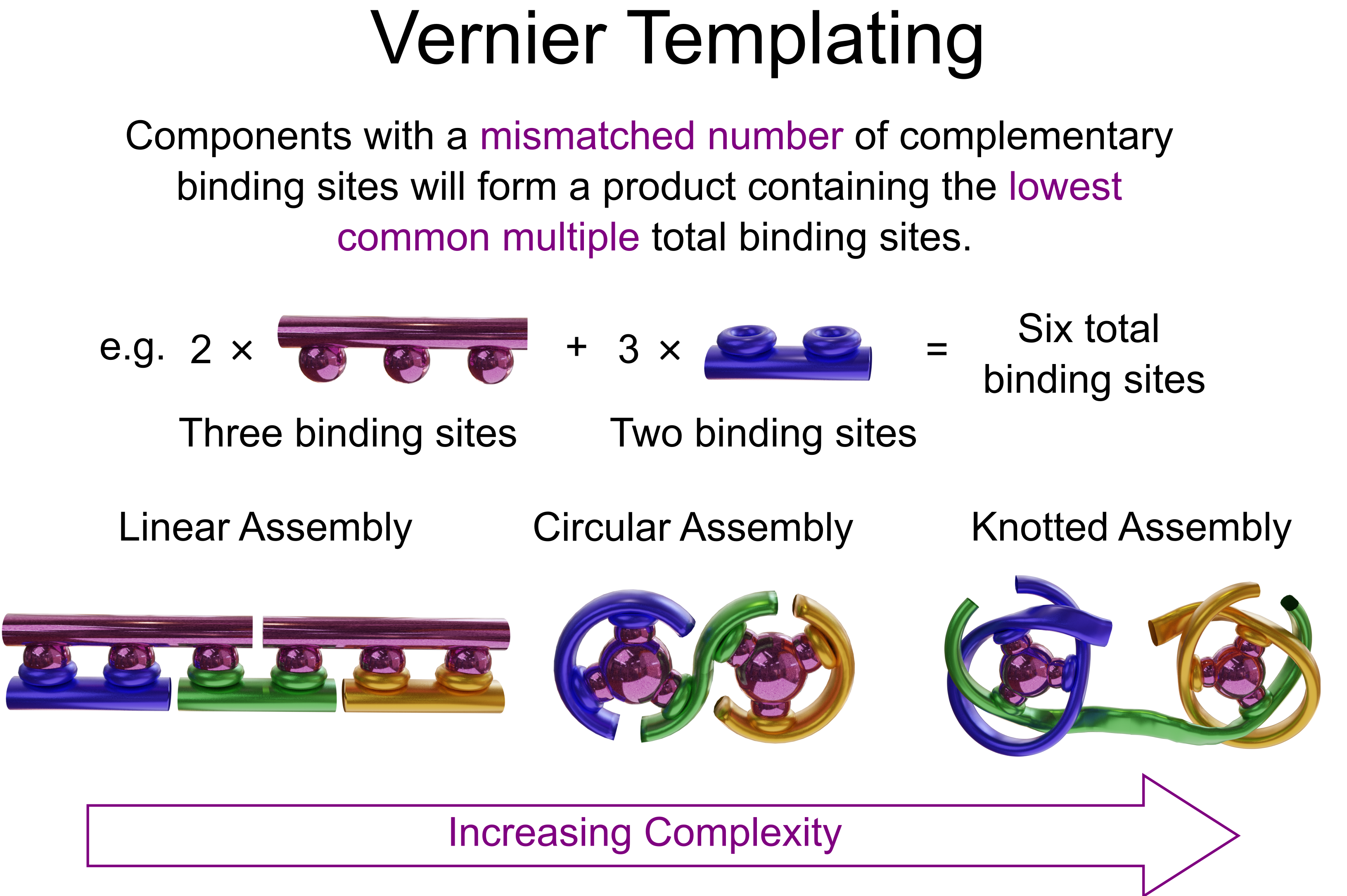 The entanglement of molecular strands has profound structural consequences: it blocks conformations, alters dynamics and enhances structural stability.1 Consequently, systematic strand entanglements affect the properties and functions of both synthetic2 and biological3 macromolecules, from small knots to large extended entangled arrays such as bacteriophage capsids4 and the kinetoplast5. Relatively small molecular knots are synthetically accessible6 through, for example, cyclic helicate7 scaffolds and template chemistry,8 but such synthetic approaches have a practical size limit. Until now there have been no strategies for synthesizing the more sizeable arrays of systematic molecular entanglements necessary for larger knotted structures and assemblies. Now the Leigh group report an effective means of rapidly and efficiently assembling such structures from small building blocks using Vernier templating.