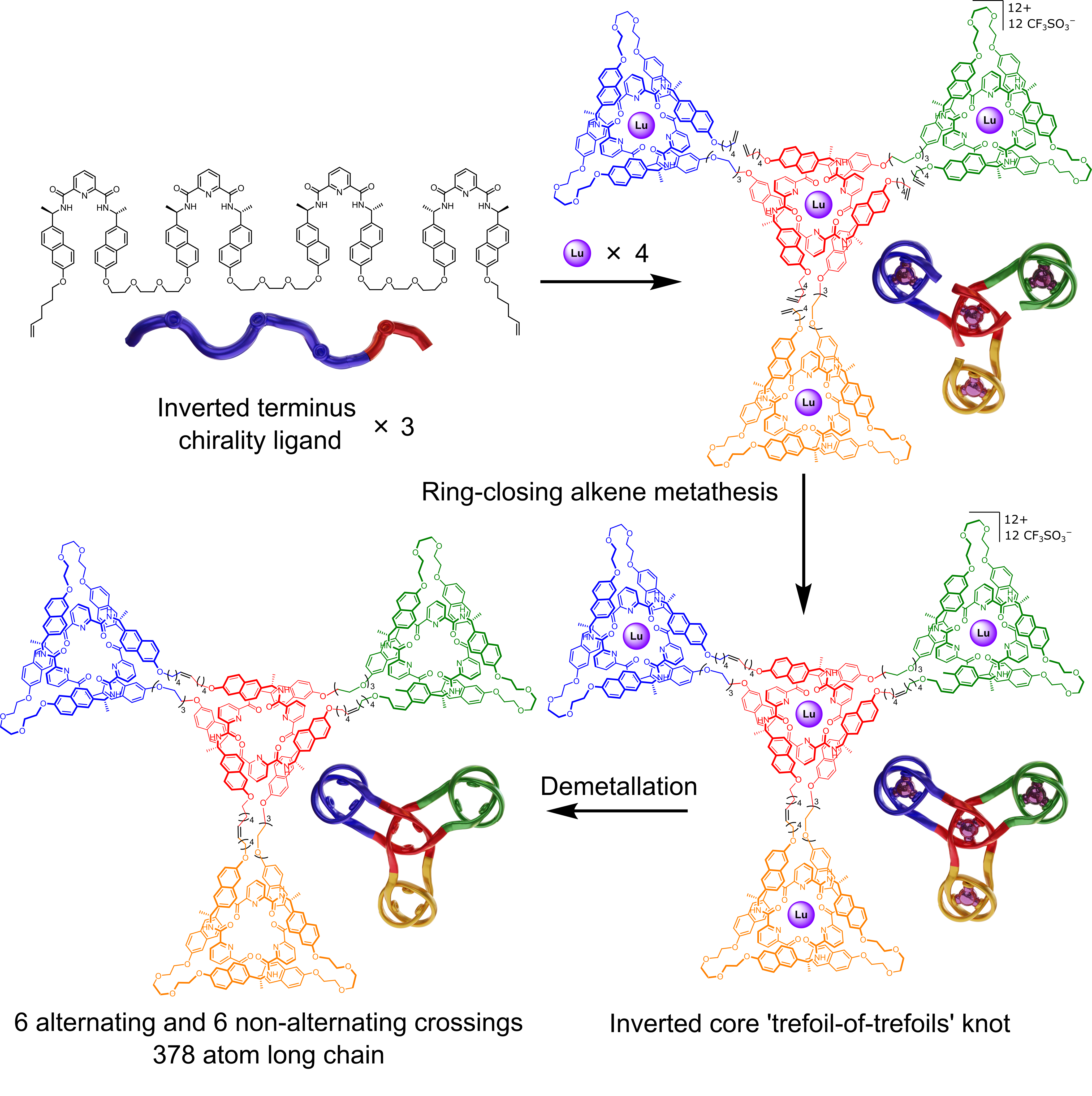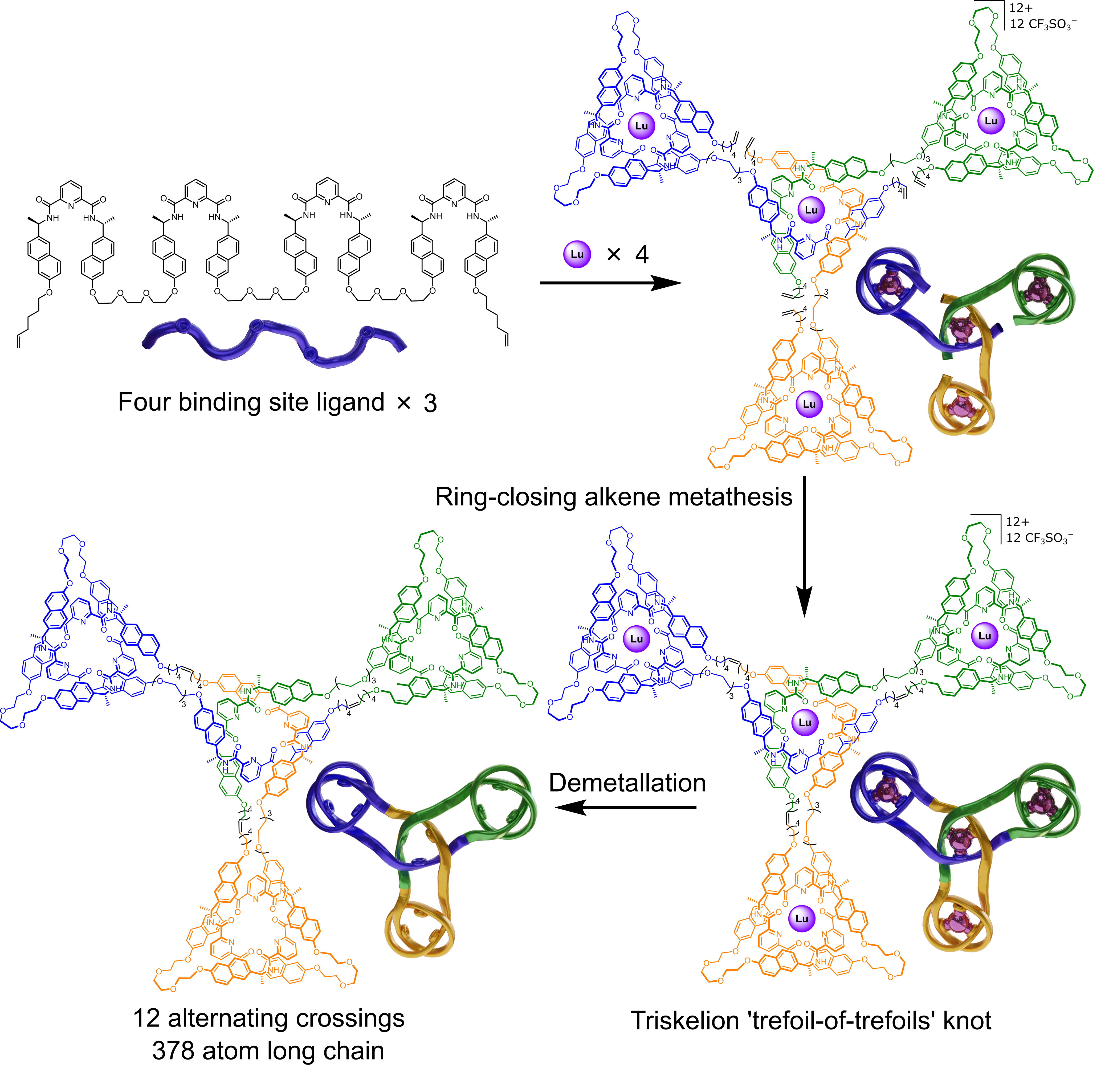 The Leigh group has now adapted the Vernier concept to the assembly of molecular knots by complexing ligand strands with two or four tridentate pyridinedicarboxamide (pdc) groups with nine-coordinate lanthanide ions: A 3:4 (tetratopic strand:metal) Vernier complex gives a 12-crossing triskelion (trefoil-of-trefoils) knot with complete topological stereocontrol (Fig. 2).11