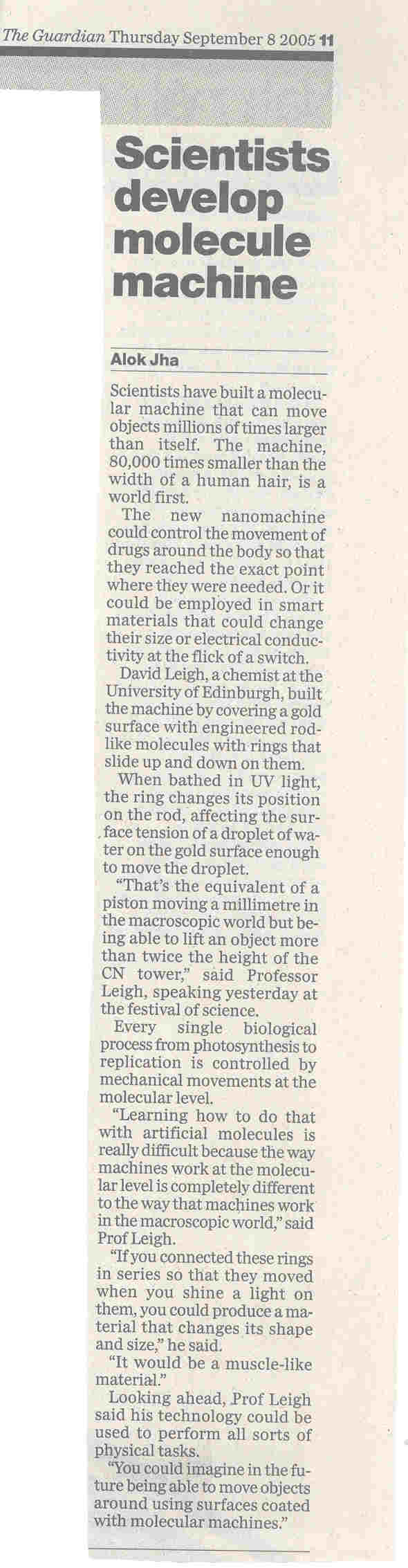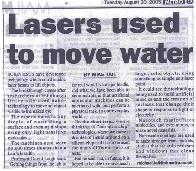 D A Leigh, M Á F Morales, E M Pérez, J K Y Wong, C G Saiz, A M Z Slawin, A J Carmichael, D M Haddleton, A M Brouwer, W J Buma, G W H Wurpel, S León and F Zerbetto, Angew. Chem. Int. Ed., 44, 3062-3067 (2005). Featured on the front cover of Angewandte Chemie issue 20, 44 (2005).